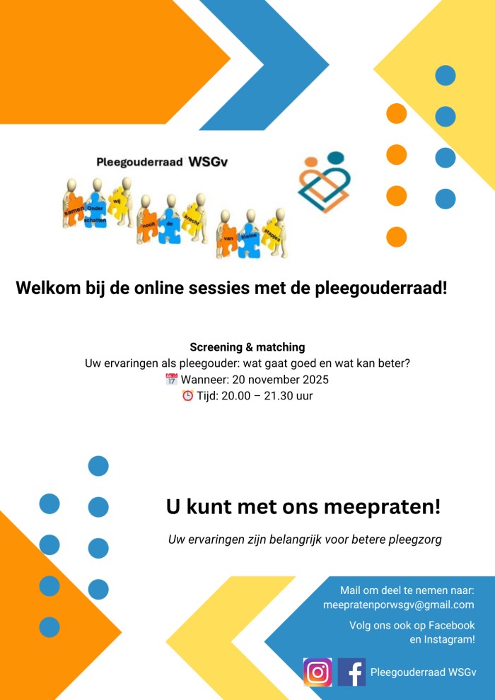 Ben je pleegouder bij de WSGV? Dan nodigt de pleegouderraad je van harte uit voor een online sessie om jouw ervaringen met hen te delen! Deze sessie vindt plaats op 20 november, dus dat is al snel. Kijk hieronder voor meer informatie.