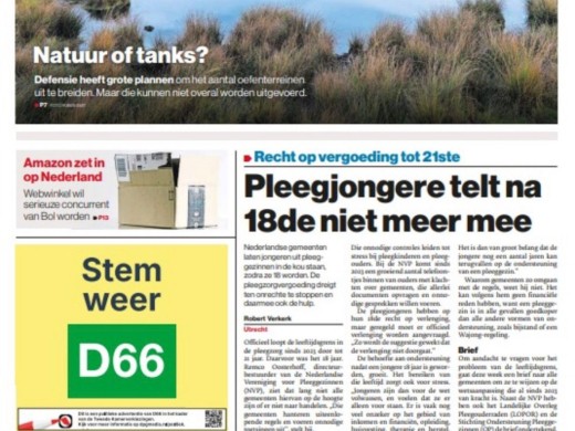 | | | | Oproep aan gemeenten Gemeenten spelen een cruciale rol in het goed laten verlopen van pleegzorg. Daarom stuurden LOPOR, Stichting OP en de NVP vandaag een brief aan alle gemeenten, met het verzoek om de wettelijke verplichting voor pleegzorg tot 21 jaar duidelijk en zonder extra drempels uit te voeren, informele netwerkpleegzorg na de 18e verjaardag beter te ondersteunen en financiële knelpunten structureel op te lossen. Lees hier de brief | | | | In de media We hebben via de media al aandacht gevraagd! Tot nu toe verschenen we in het AD (inclusief alle regionale edities), op Radio 1 en in diverse nieuwsbulletins op NPO. Meer artikelen volgen nog! Wij houden het bij, bekijk het in het overzicht.